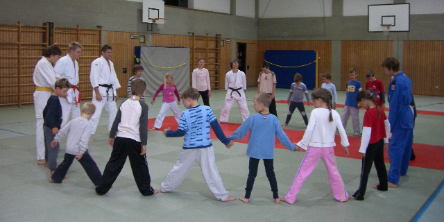 Wie im „richtigen Training“ wurde mit der traditionellen Begrüßung, dem Verbeugen, das die gegenseitige Achtung und den gegenseitige Respekt beider Kämpfer ausdrücken soll, begonnen. Damit die Muskulatur elastisch und geschmeidig wird, steht zu Anfang jeden Trainings die körperliche Aufwärmphase. Dafür wurden einige Bewegungsspiele, in denen die Kinder ganz schön „zum Schnaufen“ kamen, durchgeführt. Anschließend wurden die Kinder in Gruppen aufgeteilt. Beim Training selbst stand bei den Kleineren (5 – 7 Jahre) der spielerische Aspekt im Vordergrund. Den Größeren (8 – 11 Jahre) wurden einige Haltegriffe und die „Fallschule“ (die einen sehr wichtigen Bestandteil im regelmäßigen Judotraining ausmacht) gezeigt. Ziel des Ferienprogramms war, die Kinder zu motivieren, sich mit Judo fit zu halten und einen Einblick in das Judotraining zu vermitteln.